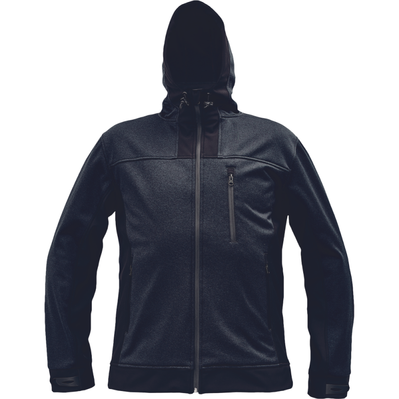 veste soft Shell zippée avec capuche pour hommes ; membrane résistante à l'eau, respirante ; 2 poches latérales zippées ; 1 poche poitrine zippée ; réglage du poignet par velcro ; cordon élastique dans la capuche.