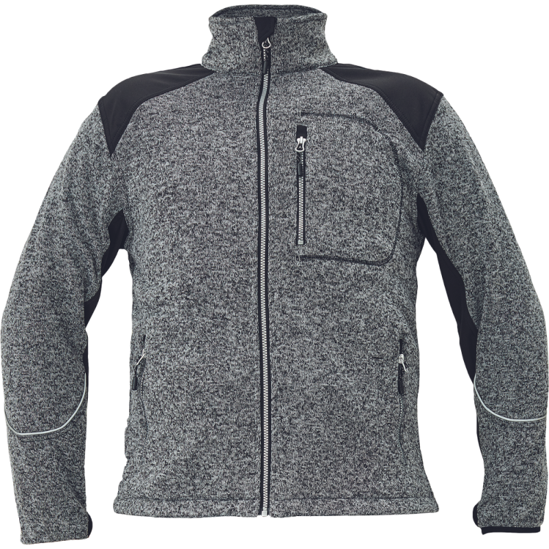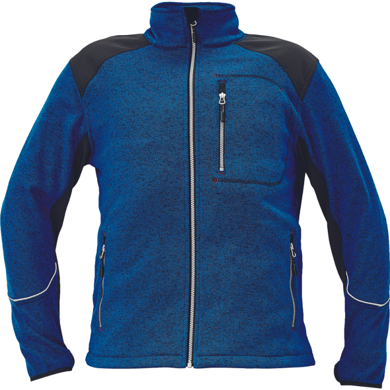 veste zippée pour hommes en tricot mélangé brossé à l'intérieur ; parties des épaules et des manches renforcées en soft Shell de couleur contrastée ; 1 poche poitrine zippée ; 2 poches latérales zippées ; ourlet inférieur réglable par cordon de serrage ; trou pour le pouce sur le revers de la manche.